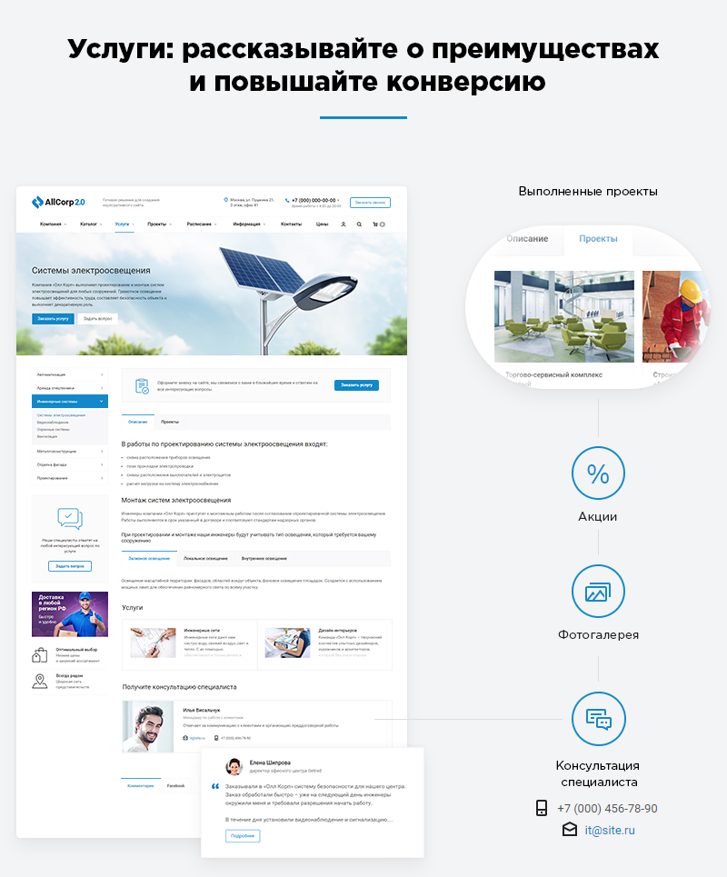 «Аспро: Корпоративный сайт 2.0» — готовый продукт для создания представительного корпоративного веб‑ресурса. Решение ориентировано на оперативный запуск сайта с типичной структурой корпоративной витрины: презентация компании, описание услуг и продуктов, новости и публикации. Цена продукта — 69 900 ₽. После приобретения предусмотрена дальнейшая адаптация под фирменный стиль и наполнения контентом. Точный состав поставки и возможные варианты доработки оговариваются отдельно.